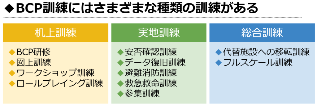 ここからは、さらに「BCP訓練とはどういうものか」を理解するために、BCP訓練にはどのような種類があるのかを解説していきます。