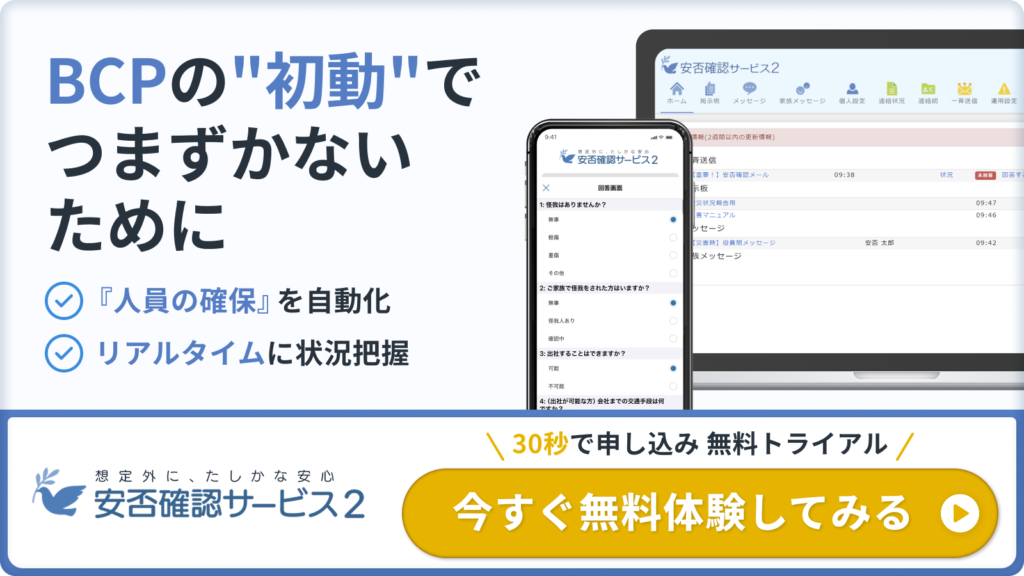 さらに、安否確認サービス2は初期費用が不要であるため、導入コストは発生しません。30日間のお試し期間があることから、導入するか迷っている企業でも利用しやすいでしょう。なお、安否確認サービス2は事業継続計画策定に必要となる機能も搭載しており、災害時の対策指示や情報共有もスムーズに行えます。